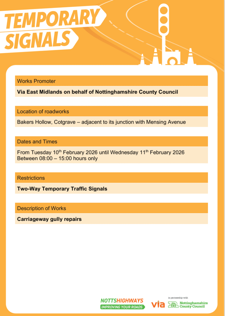 Roadworks Bulletin – Bakers Hollow, Cotgrave, Adjacent to its junction with Mensing Avenueby Jane PickFebruary 10, 2026February 10, 2026