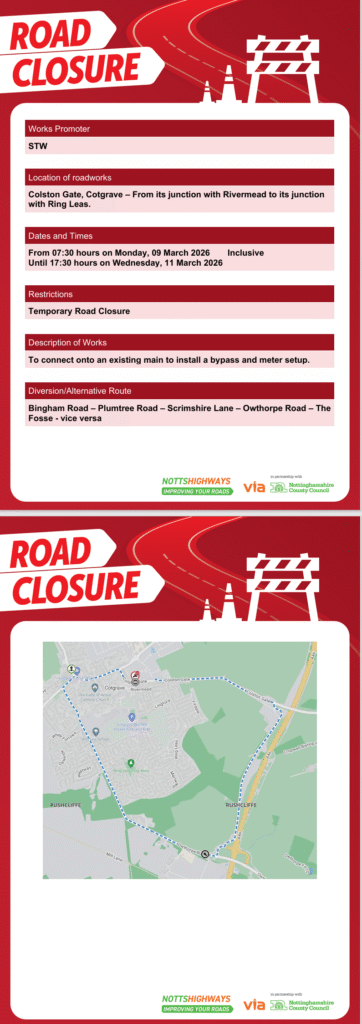 Roadworks Bulletin – Colston Gate, Cotgrave from its junction with Rivermead with Ringleas.by Jane PickFebruary 10, 2026February 10, 2026
